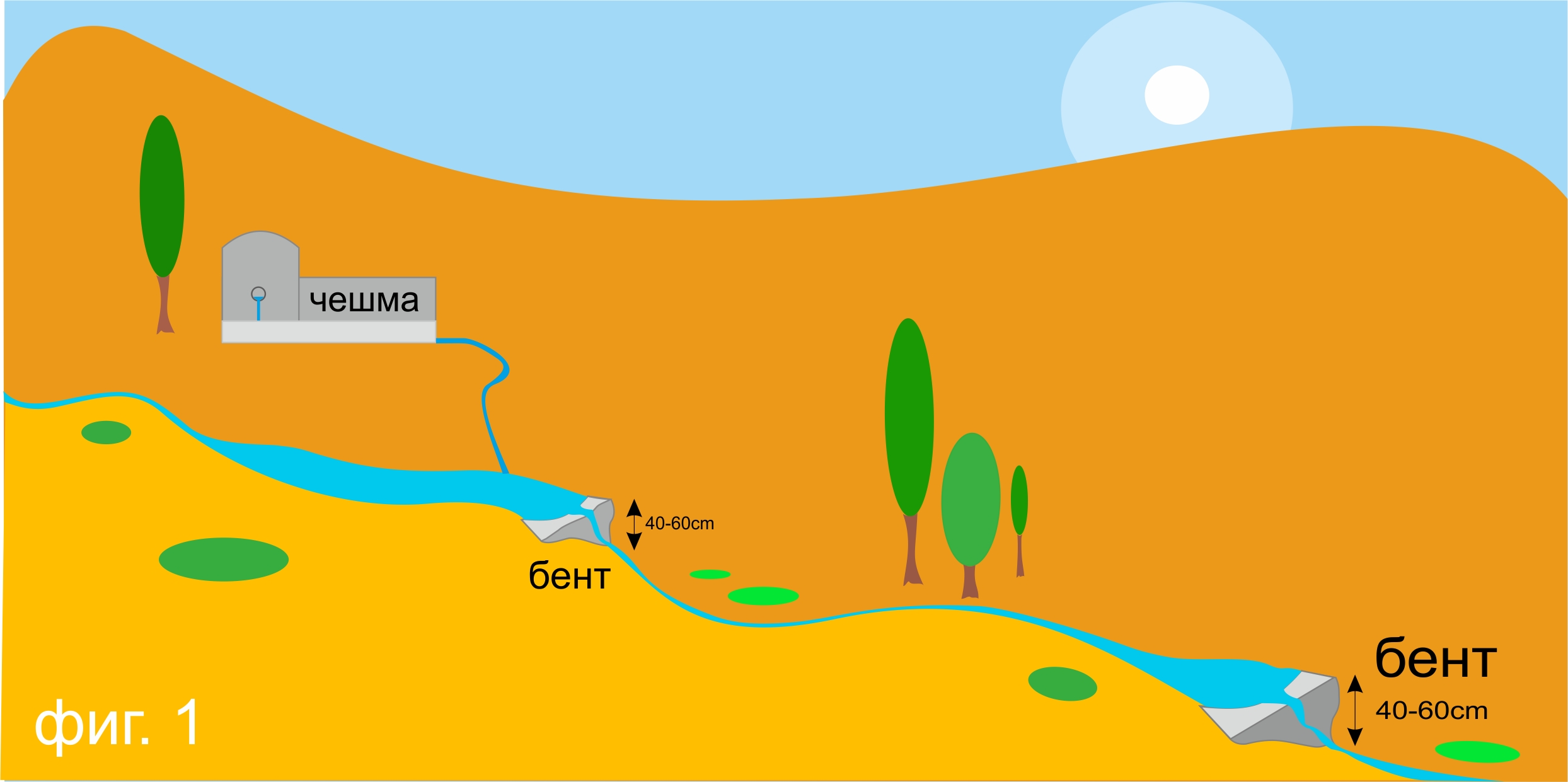 Първо: Избира се място, което е най-тясно между два бряга. Страните на бента (фиг. 7а) да се вкопаят в левия и десен бряг на деренцето. Причината за това е, че много животинки (къртици или сляпо куче), както и стичания по склона ще започнат бавно или бързо да подриват връзките и ако не е направено добре водата ще мине отстрани.