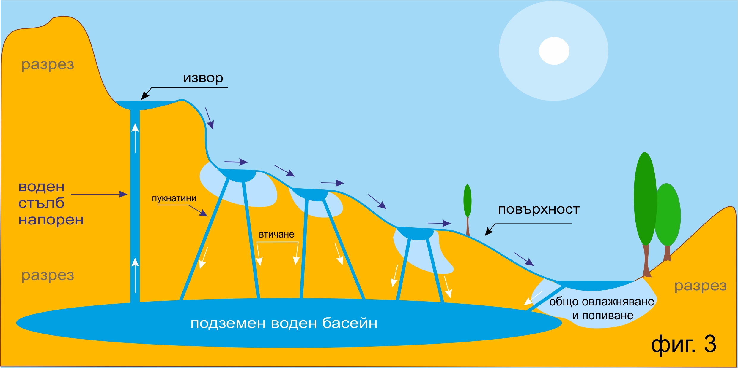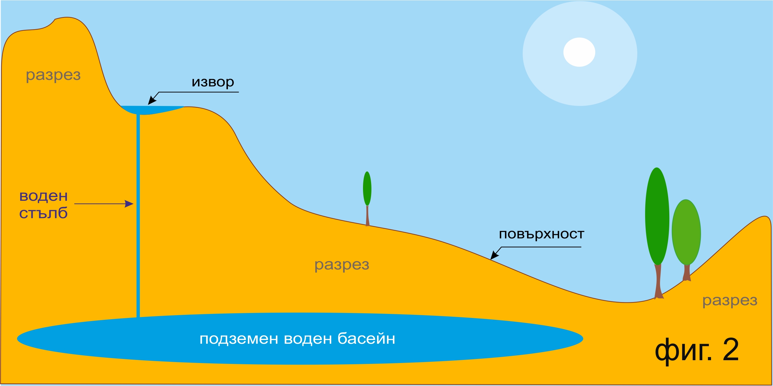 На фиг. 2 се вижда в разрез следното нещо: горна точка на извора, воден стълб и действителния източник (той може да е река, езеро или скачени езера, оттичащи се под земята води в басейни и т.н.) Ако сте забелязали в природата водата никога не тече под права линия. Така наречените меандри или завои, били то на поточета рекички или реки, служат за успокояване на водата и забавяне на нейното директно, бързо оттичане. Едновременно с това сложните терени често са предпоставка за образуване на езерца, водни тераси (както е в планината) язове и в случаите, когато имаме животни отдадени на това, изкуствени водоеми хванати на различна височина по пътя на водата от нейната начална точка. Това погледнато в разрез служи за следното. Фиг3