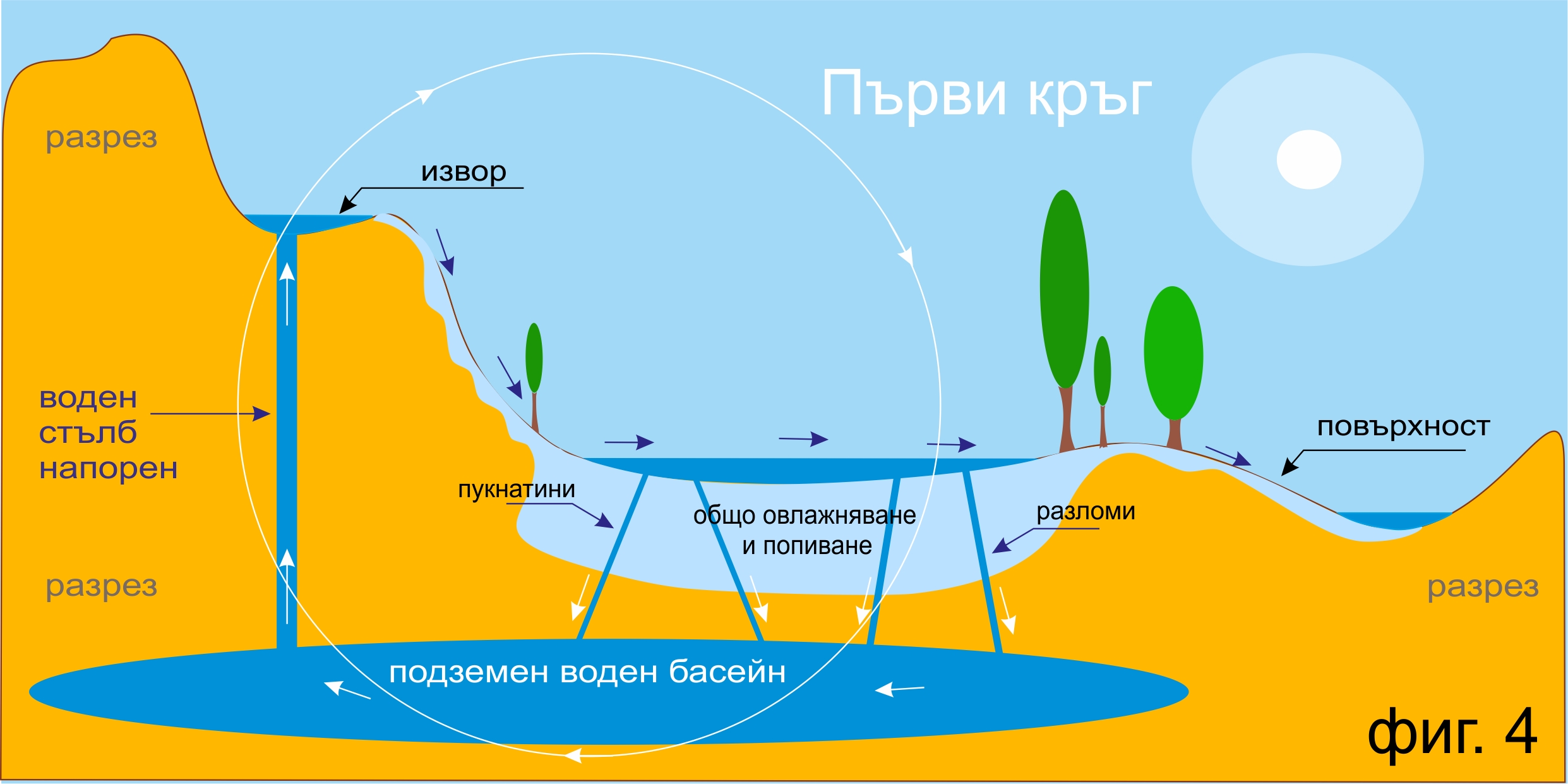 Чрез тези пукнатини, разломи и попиване водата, вече излязла на повърхността, образува една възглавница от влага която подпомогната от растителност и животински видове подсигурява неизчерпаемостта на източника. Образува се Първи кръг на циркулация - Източник-воден стълб-извор-поток-попиване-източник който е фиг 4: