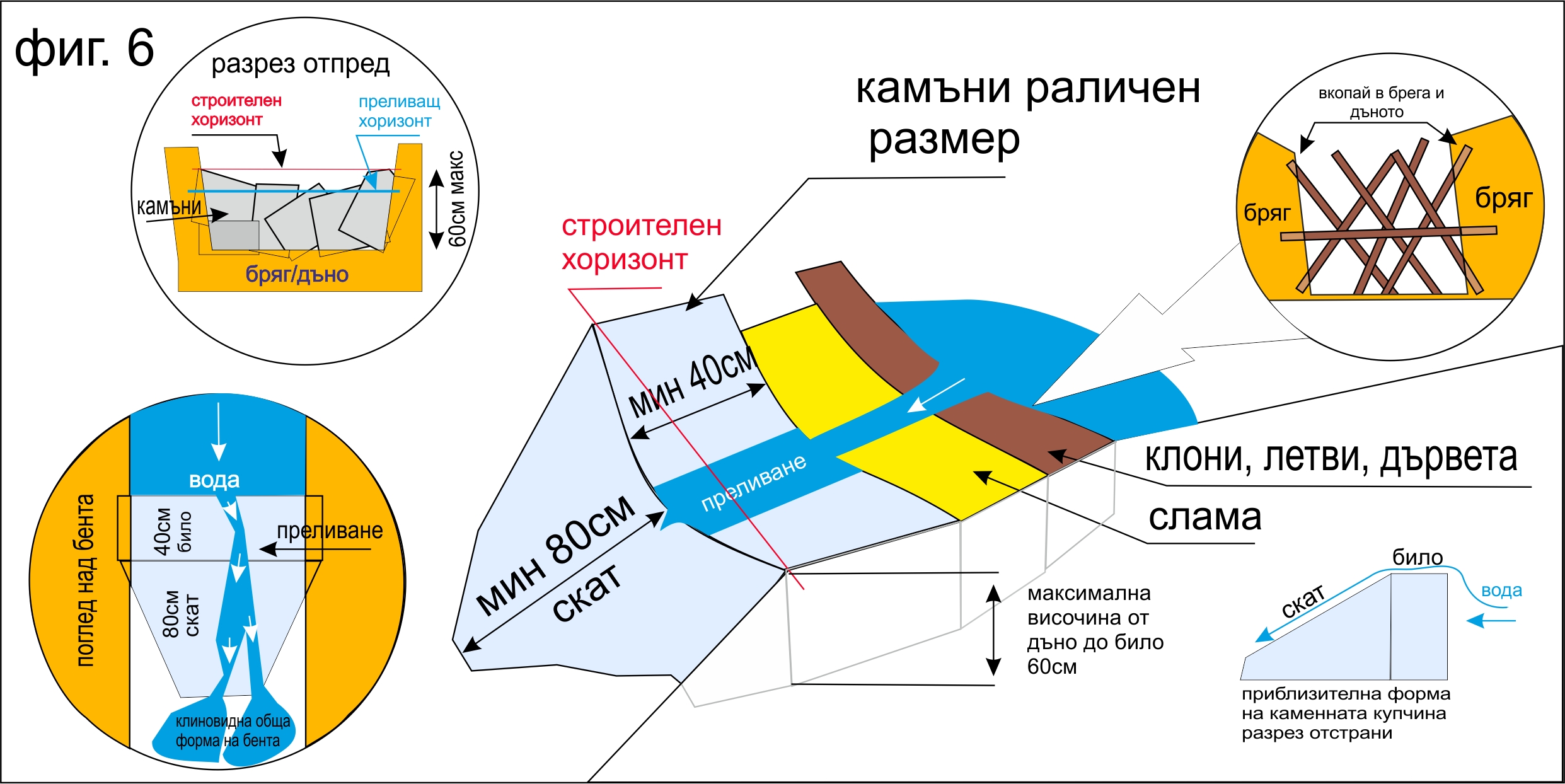 Хващанията трябва да се правят пропускливи. Запомнете, ние не искаме язовирна стена. Искаме пропусклива система, която да забавя, а не да спира водата! Обикновено се прави сандвич от материали в най-тясната част между два бряга (от страната на идващата вода се трупат като военни заграждения клони вплетени един в друг, след тях слама и най-накрая са камъните, чиято основа трябва да се вкопае в дъното (фиг6); на отделна схема ще видите и друг начин ако решите да го правите само от камъни).