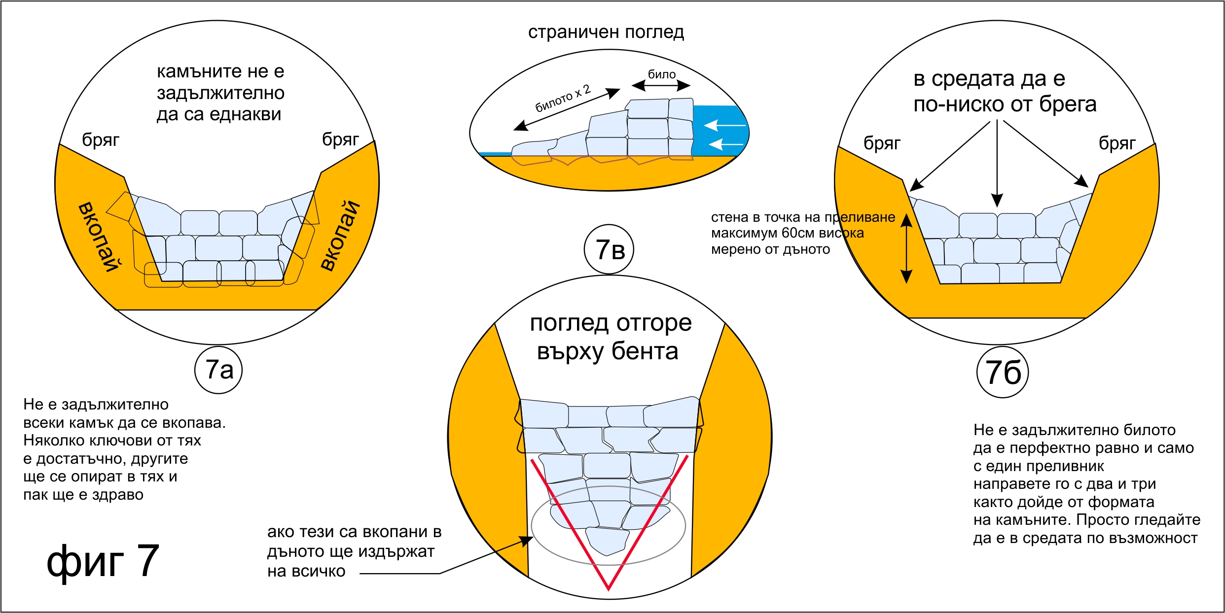 Трето: Стената, по която ще се стича водата след билото (фиг. 7в) трябва да е с форма на буквата V - това е предпазна мярка при буйно слизане на вода по дерето да не ви отнесе съоръжението. Острото на V-то се вкопава и ви служи като клин. Проверено е с потоп носещ начупени клони и всякакви боклуци, всичко отскачаше и преминаваше през бента без да го повреди. Желателно е ширината му да е 2 пъти ширината на билото или ако сте направили било 40см то стената или ската, по който водата ще се спуща от другата страна, да е 80см.